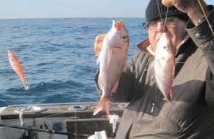 Posteriormente, atacaron de verdad los besugos aligotes, que daban cuenta rápidamente del langostino que llevábamos de cebo, e incluso de los ermitaños. Por ello, dejamos cabo para salirnos de la "mancha"; pero fue inútil, ya que rápidamente nos siguieron los besugos. Por lo que hicimos una "enmendá" como llaman en Torrevieja, yendo a otro sitio cercano, también querencioso de pageles.