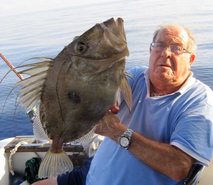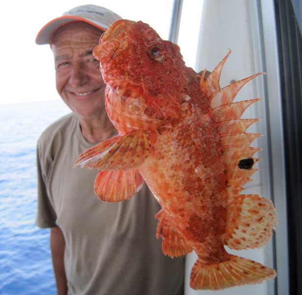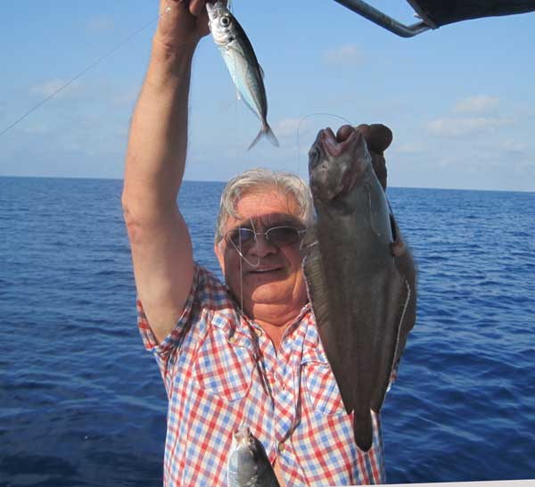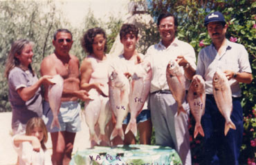 | Bajo, Antonio, nuestro veterano compañero de tantas pesqueras, con una buena gallina o cabracho |