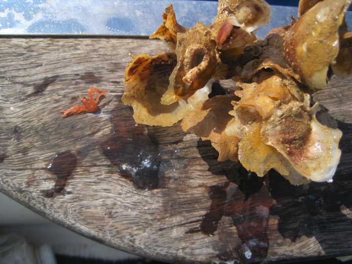 | Arriba a la derecha, lo que creo que es una formacion coralina de acantilados submarinos profundos llamada Montipora laminar que salió enganchada en un anzuelo . Dentro venía un pequeñisima cria de langosta que al cogerla para echarla al mar, se me deshizo entre los dedos. Ver fotos ampliadas |