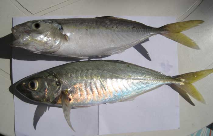 A la derecha, arriba, el que cogimos,(con el morro roto al descolgarse ya a bordo), es el jurel blano o trachurus mediterraneus . Bajo de él, (foto M.Arias) jurel negro o chicharro trachurus trachurus. El jurel blanco según Wikipedia, tiene