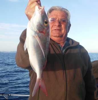 | Por todo ello, desistimos de pesca en aguas profundas y nos fuimos directamente a un pesquero de pagel en algo ma de 40 metros de sonda, en el que que en mi primera calada logré el pagel de medio quilo que muestra David en la foto de bajo y en la segunda una hermosa vidriada | ||||||