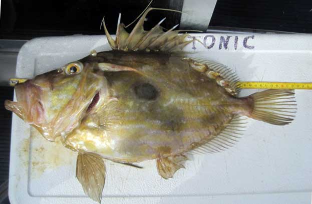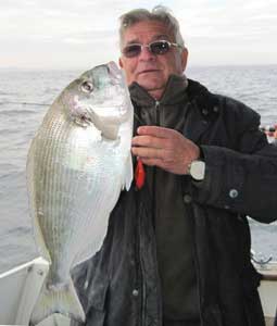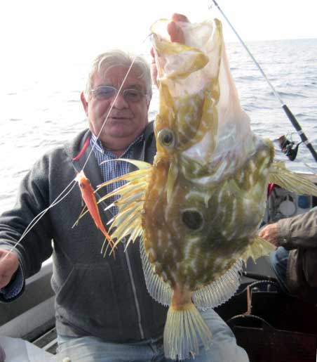 | Arriba, David con un pez de S. Pedro que atacó un pequeño tres colas que se había prendido en uno de los anzuelos del aparejo. (Pulse imagen de la derecha y bajo para ampliar) . Pesó1kg 700 y midió 43 cm |