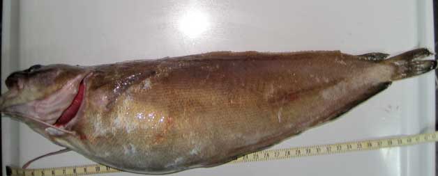 A la izda chopas hembras de unos 300 A 400 gr. Arriba brótola, hembra también (tenía los ovarios reventando de ovulos. Seve que estaba a punto de frezar), que pesó 900 gr para una talla de 43 cn |