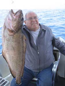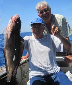 Arriba el patrón J.L. Martinez,con una brótola de 3 kg y 56 cm. A la derecha midiendo la brotolay debajo un cubo con otro de los congrios del día |