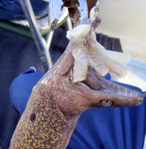 Detalle de la boca extensible y poblada de afilados dientes , de una murena de un poco mas de kilo, inevitable poblador de los pecios |