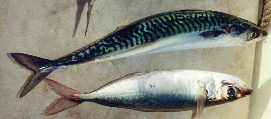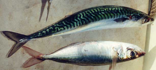 Arriba, caballa ( scomber scombrus) de 300 gr.Puede alcanzar el kilo y medio. Bajo, jurel blanco |