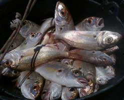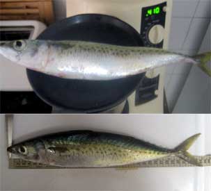 Curiosa imagen de un jurel con bandas verticales , que preserntan muchas especies, recién sacadas del agua, ocasionadas por el estress . A la dcha palomina |