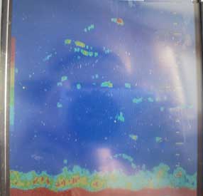 Las jurelas y estorninos se ven en forma de puntos gruesos rojos a 5, 10, y 18 m. de la superficie