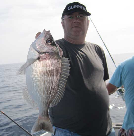 Por ello decidimos hacer una prueba en busca de sorelas el día 24 junio. Al poco de fondearnos en el sitio elegido, y una vez localizadas y cebadas las sorelas, la sonda nos presentaba este aspecto prometedor que se puede ver bajo a la izquierda. A la derecha David con una de las primeras sorelas conseguidas (amplie imagen al pulsarla) |