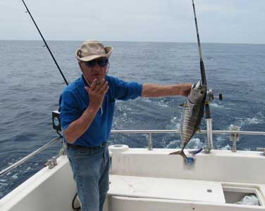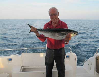 Liberando "sanjuaneros" Al poco rato, (cuenta Miguel) saltaron dos carretes consiguiendo dos atunes de 4 kg .que fueron devueltos al mar en buen estado. En las dos horas siguientes, tuvieron cuatro picadas más con atunes de similar tamaño que lógicamente volvieron a ser soltados.Mas tarde, al llegar a un concido pesquero, frente a Santa Pola hicieron algo de curri de fondo, pero la sonda no daba piezas grandes entre su barco y el fondo,75 brazas, por lo que calaron un volantín y conseguíendo unos besugos de 300 gramos. Desistieron al poco dada la gran corriente.