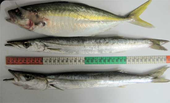 Arriba, sorela ( decapturus ronchus), con su característica línea amarilla, de tamaño de 37 cm y 500 gr. de peso. Bajo de la misma, espetones (sphiraena sphiraena) . Es la barracuda del Mediterráneo. Los adultos presentan una veintena de manchas transversales negras en la parte alta de los flancos; los jóvenes tienen una banda longitudinal- en la foto poco visible-dorada, en medio de los flancos Puede alcanzar el metro y medio de talla. Es una especie muy voraz, y los ejemplares adultos, pueden ser peligrosos para el hombre . Los grandes ejemplares pueden ser, en zonas tropicales, algo tóxicos, segun algunos autores( al parecer por acumular en su carne, toxinas de especies dañinas). Entre nosotros no lo son y su carne es sabrosa. Es un cebo muy apetecible para choas y palometones. A bordo del Chambel dos, los mas grandes conseguidos, lo han sido con este cebo, paseado al currican de fondo lentamente |