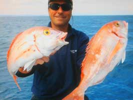 Esos días quedó encantado y agradecido por la pesquera y por lo que pudo aprender, de estos tres veteranos, él, que se considera aún novato en este apasionante deporte . Porque en uno de los días aparte de vidriadas y chopas consiguieron pageles, 4 de los cuales me asegura que pasaban del kilo y medio, y en el otro lograron un buen dentón y tambén algunos pargos y un pez de S. Pedro . Pulsen imágenes para ampliar |