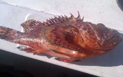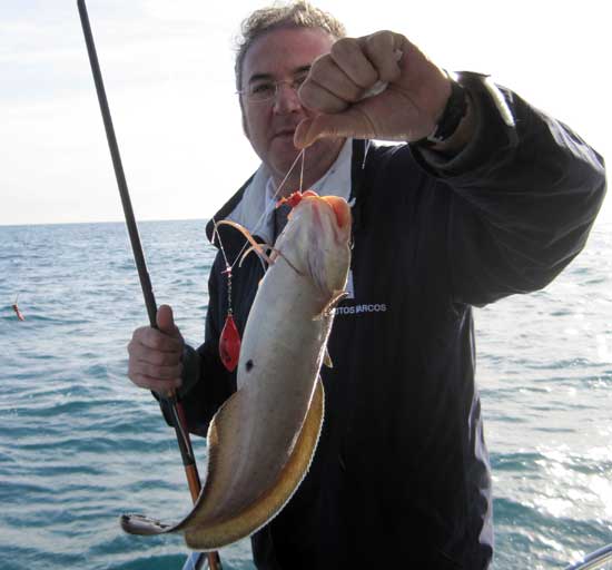 Bajo, el patrón del GLAND, despide el año con dos buenas piezas. Una brótola y una bonita dorada "del terreno". La única que subimos a bordo ese día .( Pulse imagenes para ampliar) |