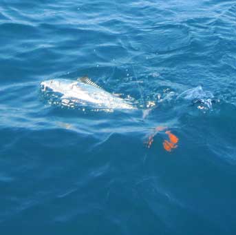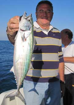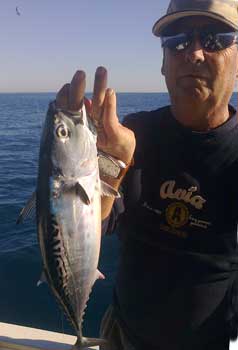Luis tuvo la intuicón de calar un pequeño jurel vivo.Al poco, una tremenda sacudida en su fina caña, y una enorme resistencia al tratar de izar el pescado, y unas huídas incontrolables a media agua, nos tuvieron emocionados y expectantes un buen rato, pensando que debía ser un buen dentón. Luego resultó , que se trataba un bonito de cerca de kilo y medio, y 48 cm el que había atacado el jurel, pero enganchándose, no por la boca , sino de un costado por lo que la resistencia que ofrecía era mucho mayor.