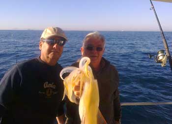 A la izda "el maestro" con un buen ejemplar. A la derecha, el patrón, con una vidriada de unos 7 años.Que yo tenga computada, ´Luis Llor tiene el récord local, con una vidriada pescada el año 2011 en aguas de Torrevieja Tenía 31 cm y 740 gr. de peso y unos 12 años de edad.Pulse aquí . Bajo una cuantas imágenes de las captura en la última fondeada, ya camino de Torrevieja .