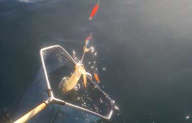 Calamar de unos 700 g. que entró a un "pajarito", pescando a embarcación fondeada |