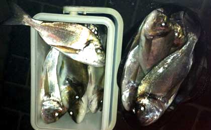 Una buena dorada de piscifactoría (ver la intensa mancha negra del operculo) probablemente engordada en hábitat natural |
