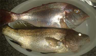 A mediados de enero me han remitido las fotos que incluyo a continuacion. Las dos primeras corresponden a una pesquera hecha recientemente en 20 m. de sonda por Jose Martinez. Dos corvas o corvallos de unos 700 gr y un pagelonj mas o menos de ese peso