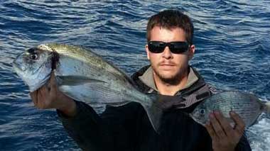 | A la izda fondo abrupto con falsos corales. En el centro, David con un pagel de mas de medio kilo. A la dcha imagen de un pequeño pecio, por encima del cual había abundante pescado, pero mas bien pequeño |