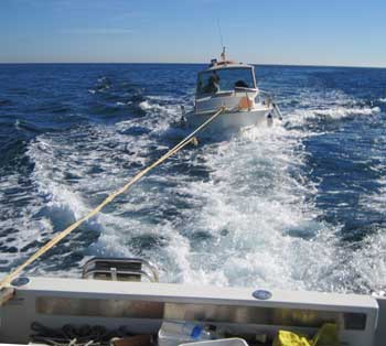Aquel dia, 31 de enero, el pronóstico del tiempo era inmejorable, entre tantos dias de ventoleras desesperantes. Por ello aunque teníamos un tiempo muy limitado, pues a las 2 teníamos que estar en Orihuela, hicimos una salida de pesca que resultó muy placentera. El único incidente, es que tuvimos que hacer un remolque, cosa que nos recortó aun mas el tiempo de pesca, cuando precisamente teníamos un banco de peces variados debajo de la quilla. Pero ...nobleza obliga en estas situaciones, entre la gente de mar.