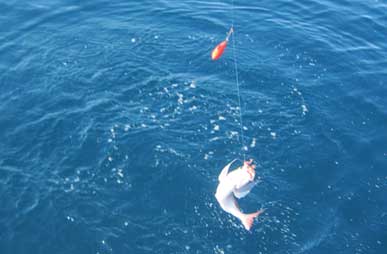 Se trata de Salvador Juan Campos, patrón de la embarcacion Enigma 2 , que tiene como puerto base Marina Internacional. Me manda las fotos de dos capturas recientes hechas por su esposa y él (siempre salen juntos de pesca). Lo curioso de una de las capturas es que el pez golondrina o chicharra le entró a un pajarito pues estaban pescando calamares.Pulsen las imágenes para ampliar |