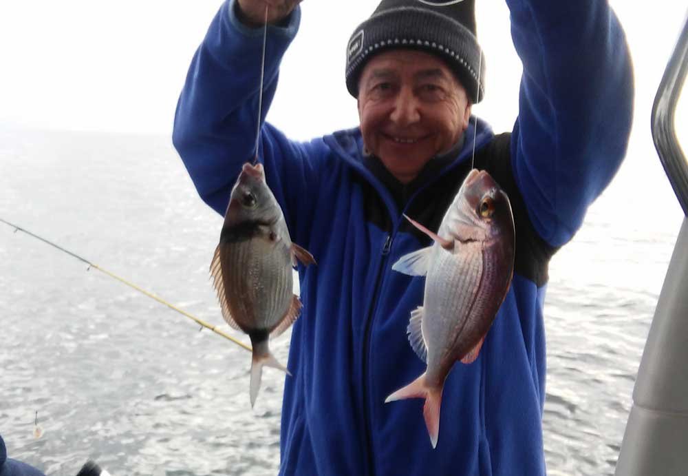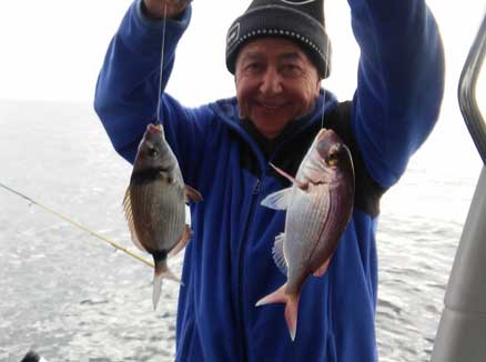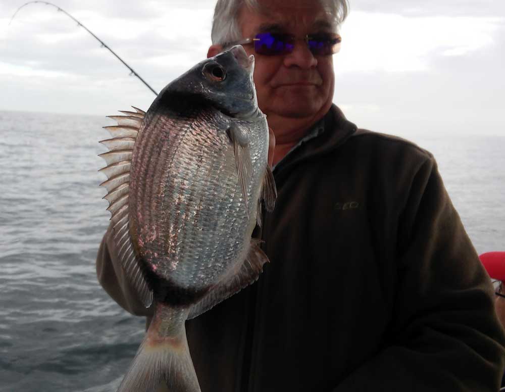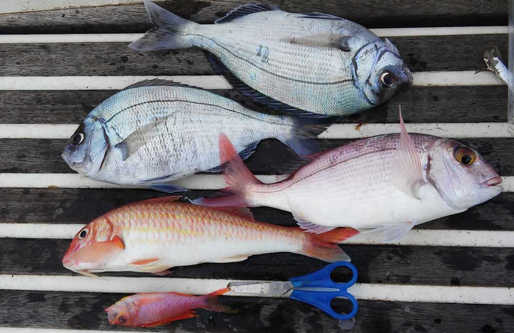 Arriba David con la pieza reina de la mañana un salmonete de roca 30 cm y 350 gr de peso. A la derecha una buena vidriada de las varias que capturamos en este rico enclave |
