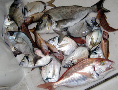 Arriba, dorada de kilo y un pagel de mas de medio, fueron las mejores piezas de este modesto pero bonito rancho a bordo del Avizor: chopas, serranos, tres colas, mojarras, pagel y dorada, pescados en un fondo rocoso a pocas millas del puerto de Torrevieja