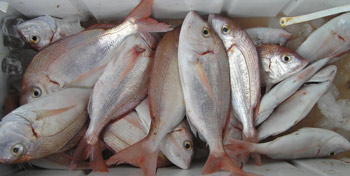 Foto remitida desde el R.C.N. de Torrevieja, de una buena pesquera de pagel, hecha abordo del DUNA patroneado por Ignacio Vergel. Con la llegada del frio el pagel ha aparecido puntualmente en sus enclaves querencioso:, desniveles de roca y fango, fondos mixtos de arena y cascajo etc