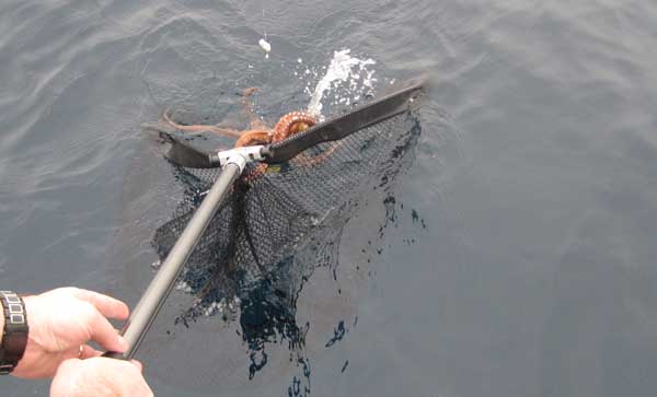 Salabrando un pulpo que primero se defendió soltando un chorro de tinta para camuflarse, y luego soltó un vigoroso chorro de agua por su sifón, intentando huir.