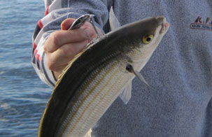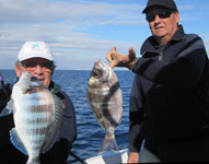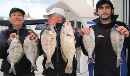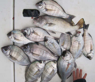 Arriba mis compañeros, con las mejores piezas: Chopas de 3 cuartos al kilo y una corva o corvallo de 1,100 y 43 cm de larga. Bajo puede ver otras imagenes de la pesca, incluido algunos dobletes de chopas de medio kilo, Pulse fotos para ampliar