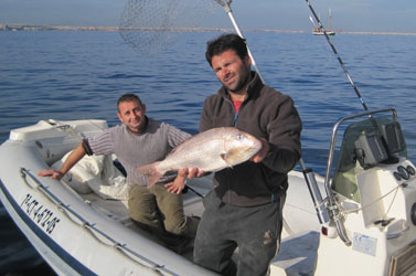 Despues de tocar inumerables caladeros, dimos con un aceptable enclave, en unos 35 m. de sonda donde nos hicimos con un buen puñado de vidriadas, serranos, alguna chopa, y donde capturamos al jigging algunas seriolas. Al atardecer, el patrón, José Manuel, en su primera calada clavó un buen dentón de mas de dos kilos. Otro tanto logró un colega que pescaba a la deriva junto a nosotros, Paco, de Cartagena, que pescó otro dentón algo menor, cuyo peso le calculamos que andaría cerca de los dos kilos.