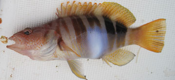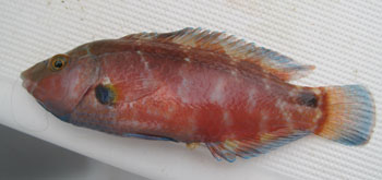 Quiero incluir las fotos de dos especies muy bonitas que capturamos en el mismo día , y que tienen nombres semejantes. Una es mas conocida: la vaca serrana (Serranus escriba) (a la izda), perteneciente al genero de los serranus ( como la serrano-cabrilla o el merillo). La de la derecha es mas rara de capturar, es la vaqueta ( Symphodus meditérraneus) de la familia de los lábridos, como tordos, viejas etc . Es un ejemplar macho, adulto. Las hembras tienen una coloración algo diferente |