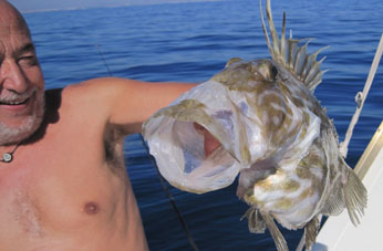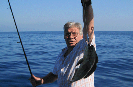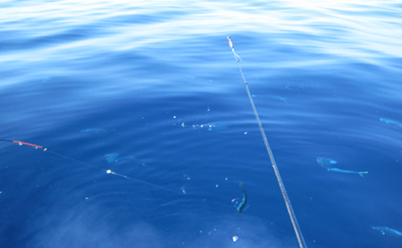 La pesca de lampugas , localizándolas al curricán y pescándolas luego al jigging, ha continuado. A primeros de mes hemos pesado ya ejemplares de 1,200 gr, que ofrecen una resistencia endiablada para las finas cañas que utilizamos. No es raro pescando todos los de abordo al jigging, concentrar bajo del barco varias docenas de lampugas, que se lanzan competitivamente tras los señuelos , en cuanto caen al agua y les damos varias sacudidas. Ese día comprobamos que también se lanzaban tras las rapalas Rh de pequeño tamaño, consiguiendo también al jiggig varias lampugas.Pero ciertamente las rapalas eran mas conflictivas, ya que motivaban a menudo arrastres defectuosos, al trabarse, la potera delantera, en la línea. |