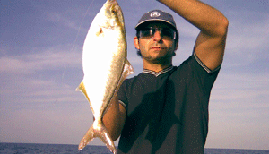 Jose M. Medina con una seriola de cerca del kilo pescada a bordo del Chambel dos
