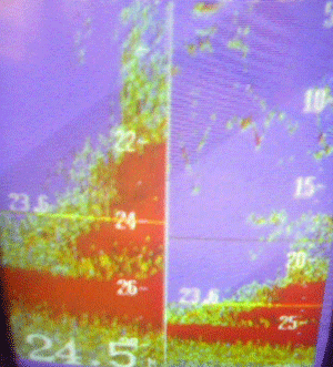 Una de las pesqueras de este mes puede ser la búsqueda de seriolas en torno a los pecios o las farolas flotantes de las piscifactorías. Actualmente, las juveniles de esta especie, tienen ya un peso entre 900 y 600 gramos y entran bien a los jigs Halco de 30 a 50 gr. Bajo,imagen de las mismas en la vertical de un pequeño pecio hundido en 25 m. de sonda. Los puntos rojos gruesos, y las imágenes de trayectorias en color blanco que se ven en la pantalla de la sonda, a bordo del Chambel Dos, entre los 5 y 15 m. de sonda, son de éstas, en un buen día de pesca de comienzos de octubre. Mas profundamente, cerca del casco- en rojo intenso-, imágenes amarillentas de peces de fondo |
