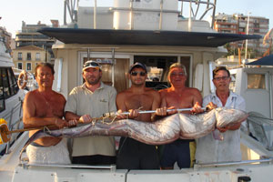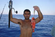 ![]() También en agosto, pescando de noche, en sitios puntuales, cerca de los algueres , se pueden conseguir piezas interesantes, como sargos de mas de kilo, alguna dorada y corva, como la que muestra este veterano, Fernando Marcos, compañero de tantas buenas pesqueras sobre pecios |