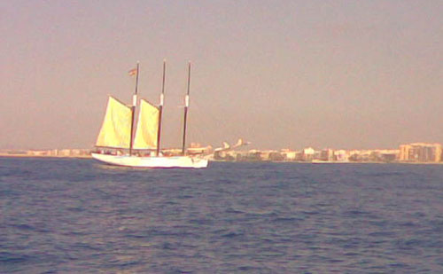![]() Una bella imagen de ese día de pesca. El Pascual Flores barco insignia de la Torrevieja de comienzos de siglo, desplegando su velas cangrejas a la salida del puerto |