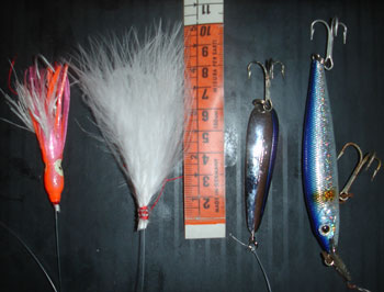 Arriba, nuestros señuelos favoritos para el bonito, plumas, cucharillas, pulpitos pequeños con plumas y artificiales pequeños |