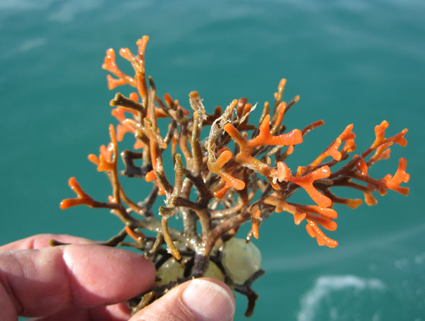 El coral rojo, presente también en el Mediterráneo se puede confundir con una colonia de briozoos denominada Myriapora truncata , ( que es la que presento arriba a la derecha) aunque ésta es de color naranja, tiene las ramificaciones regulares y acabadas en forma plana. Además, una vez muerta pierde su color, mientras que el coral mantiene su color.