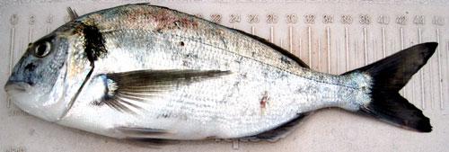 Arriba, sargo picudo de 25 cm. Bajo, dorada de 42 cm y mas de kilo y cuarto . (Para 40,5 cm de talla pesan 1,100) Edad : 4 años