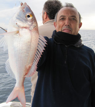 Pese a la prediccion del tiempo, que daba componente O. de fuerza hasta 5, tuvimos un placentero dia de calma con temperaturas primaverales. Al cesar el viento nos roló el barco a favor de la corriente por lo que perdimos el contacto con este banco. Fondeamos de nuevo buscando la doradas grandes, y al poco estaban alli, aunque escasas en número. Pero ellas, los pageles que también hicieron acto de presencia y un par de buenos calamares, nos redondearon una agradable mañana de pesca, dando avante pronto, a la 1 para comer con la familia . Bajo unas cuantas fotos de ese día |