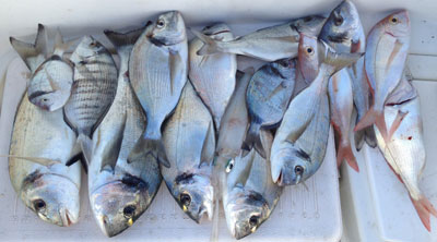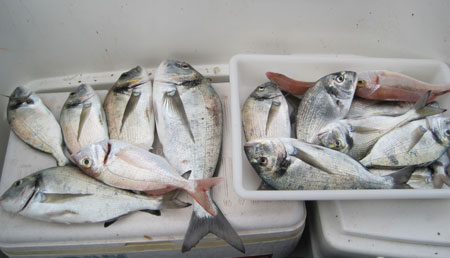 Una buena pesquera de sargo vidriadas, pageles, doradas y un calamar ( Fotos del patrón Luis Llor) |