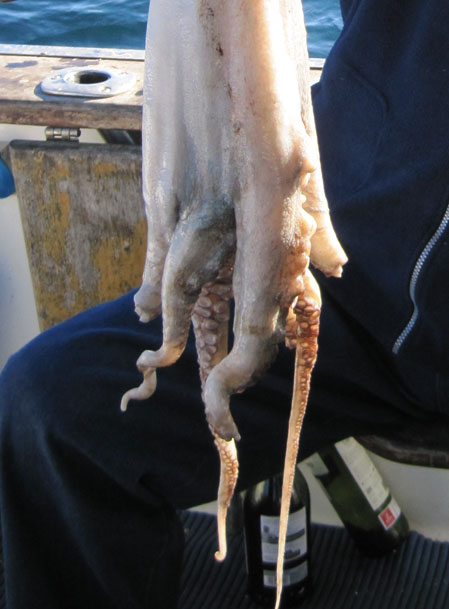 Dos curiosidades sobre los pulpos. En esta zona, capturamos este pulpo de mas de dos kilos de peso, cuyo color blanquecino, lo adquirió al meterlo- aun vivo-en una bolsa blanca de plástico, gracias a su poder de cambiar de color (mimetismo), de acuerdo con el color del hábitat . Otra curiosidad es su poder de regenerar sus patas . Este pulpo, por lo visto, fue atacado en numerosas ocasiones, probablemente por murenas o dentones-la zona es rica en ellos-. Si pulsa la imagen verá patas en vías de regeneración y otras en las que se ve claramente su regeneración casi completa, visibles al asentar sobre zonas gruesas de alguna pata, secciones mas finas, siendo sensiblemente mas cortas que las normales del peso y talla de este ejemplar.