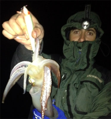 | Pese al frio de la tarde - noche, algunos colegas, como nuestro buen amigo Javi de Torrepesca, salen estos días a pescar al curricán el calamar en unos 9 metros de agua. Nos dice Javi, que pesca a una velocidad de 2 a 2,5 nudos con señuelos de calamar con babero. |