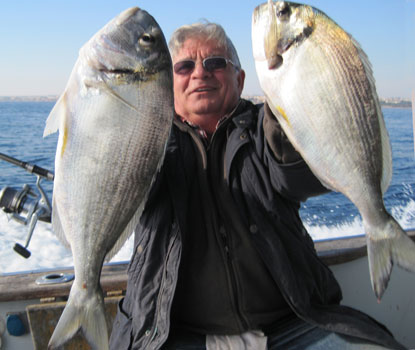 | Arriba, Jaime y David con doradas de de cerca del kilo.La mar permaneció en calma casi toda la mañana |