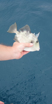Al poco de fondeados, un banco de peces ballesta o "escopetas" que es la acepción local del balistes carolinensis se congregaron bajo del barco, consiguiendo un puñado de ellos. Conservamos los dos o 3 mas grandes y el resto los volvimos al mar. Matuvimos dos vivos y los llevamos al acuario del club. Ver imagen inferior.
