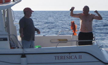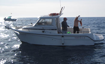La pieza mas destacable por la emocionante lucha que ofreció, fue un águila marina de 3 o 4 kilos de peso, que ni siquiera quisimos subirla a bordo, dado su temible aguijón . Desde la bañera le liberamos al mar |