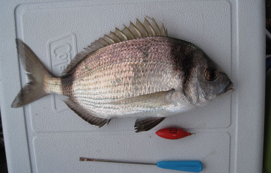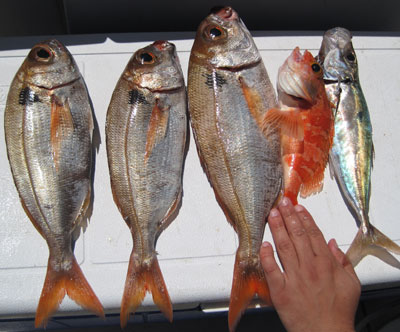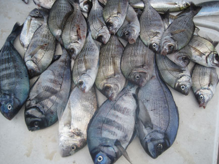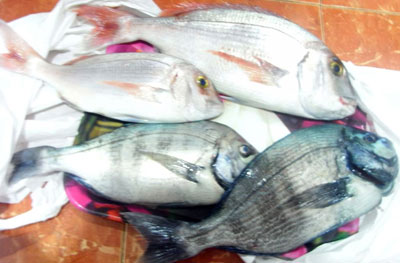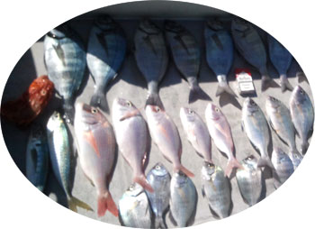 | Bajo, un buen pargo y una selección de la pesca del día : Pargos en torno al medio kilo y chopas de 800 a 1.200 gr. |