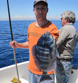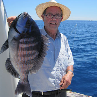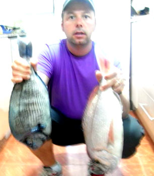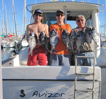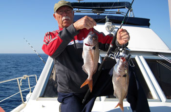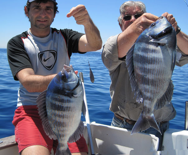 Arriba, salabrando una buena chopa. A la derecha el patrón del Avizor con una de las capturas |