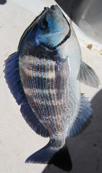 .Tampoco fue mal. Eso si, el viento cambiante , la mar de de levante, y el poco de corriente hizo que no fuéramos muy precisos en el fondeo, por lo que hasta las 10 -había salido a las 7, 30,- no subíamos nuestra primera chopa. Y es que éstas se encuentran preferentemente en las partes mas altas de los fondos rocosos, por lo que hay que afinar bastante en el fondeo, si se trata de pequeños arrecifes submarinos a profundidades medias